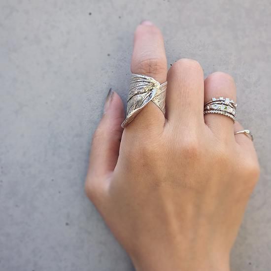 リアルサイズのスズメ蛾の羽を指に巻き付いたデザインの大振りなシルバーリング(sv925)。怪しさを魅了するデザインは、アクセサリーブランドTORQUATA(トルクアータ)ならでは。羽のテクスチャーにこだわり、表裏の両面に施された葉脈のデザインが、独特な雰囲気を演出しています。羽の一部分がめくれているのがアクセントになっています。上下で着ける向きや角度を変えると、印象が変化するのも魅力です。フリーサイズで、サイズのご調節ができます。