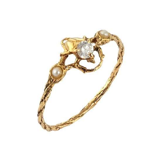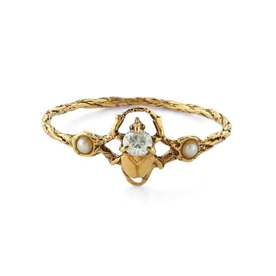 TORQUATA(トルクアータ)のK10 goldシリーズのリング。中央にはハナムグリがデザインされ、ハナムグリのボディにはダイヤモンド、両サイドにパールがあしらわれています。シンメトリーなデザインは、まるでアール・デコのような気品ある落ち着いた雰囲気を演出。さりげない昆虫のモチーフが個性的な印象に。重ね着けにもオススメです。